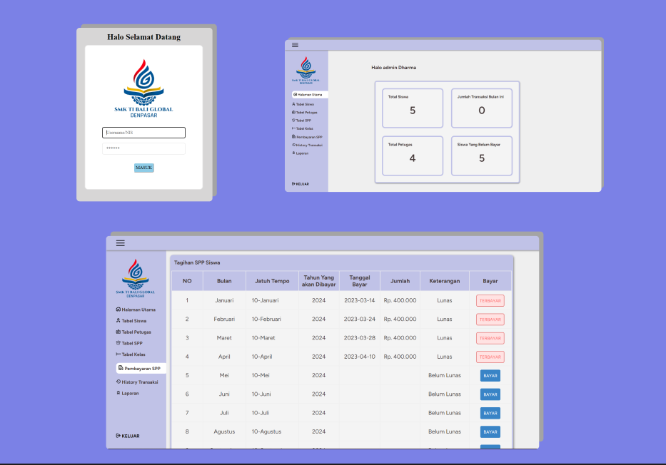 Using HTML, CSS, JavaScript, PHP. This Website made for a school admin to insert Payment Tuition for Students and Students also can check their data, like how many they already paid the Tuition.